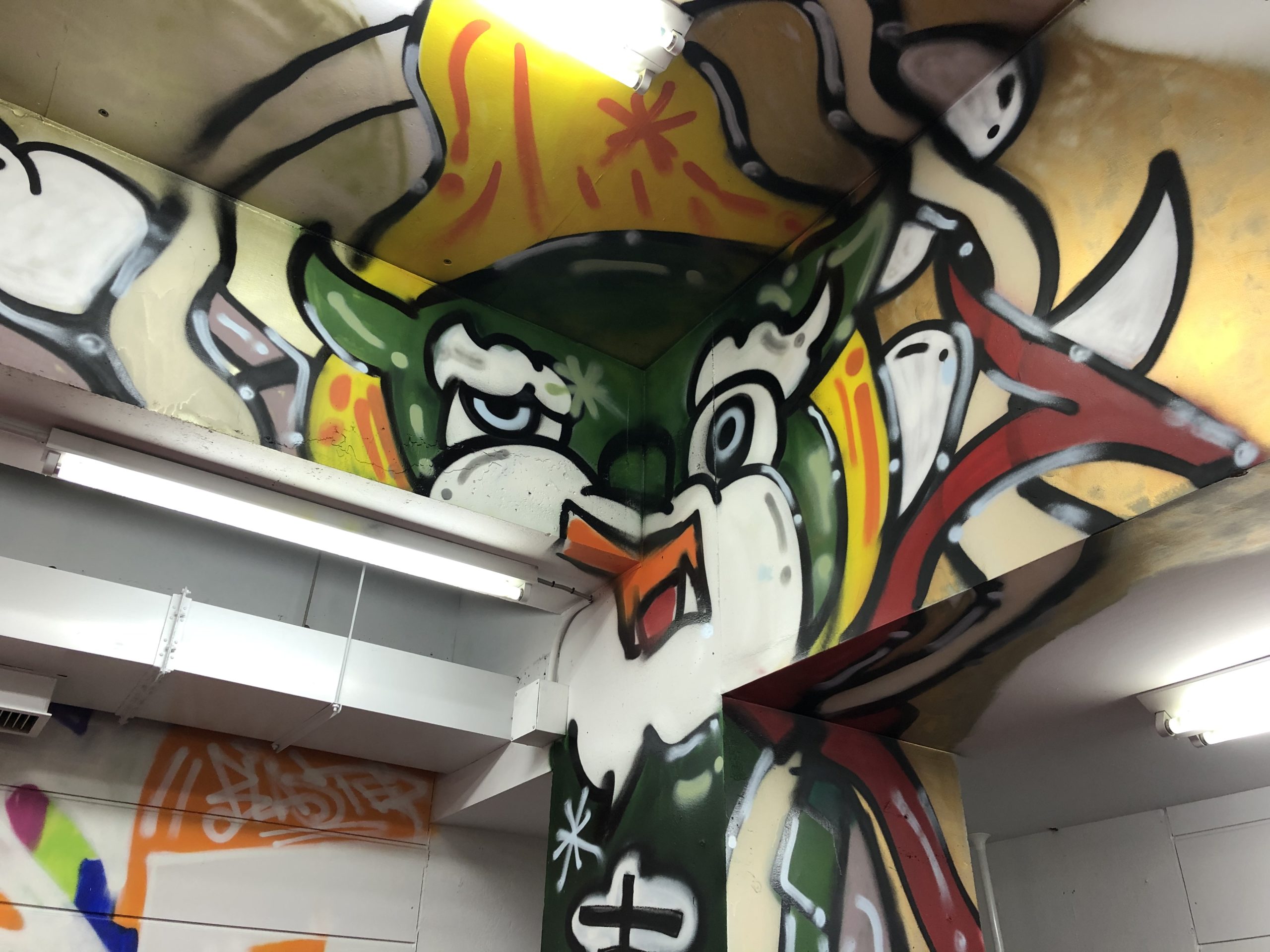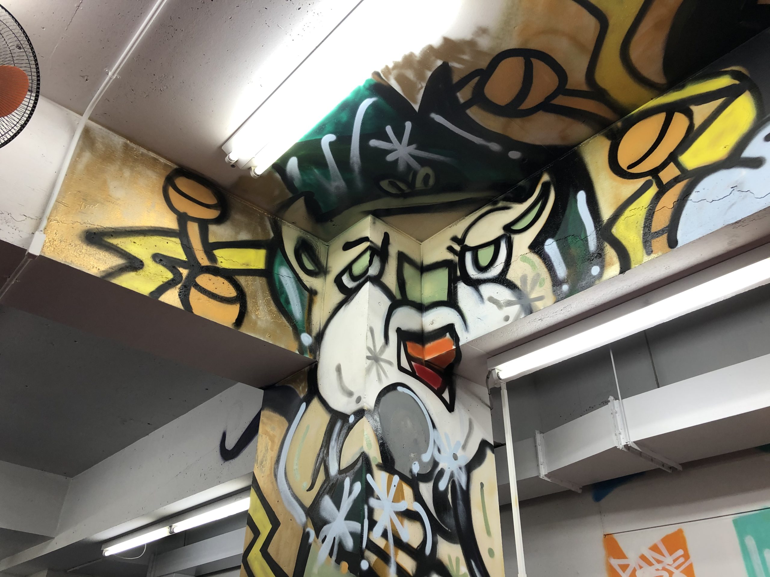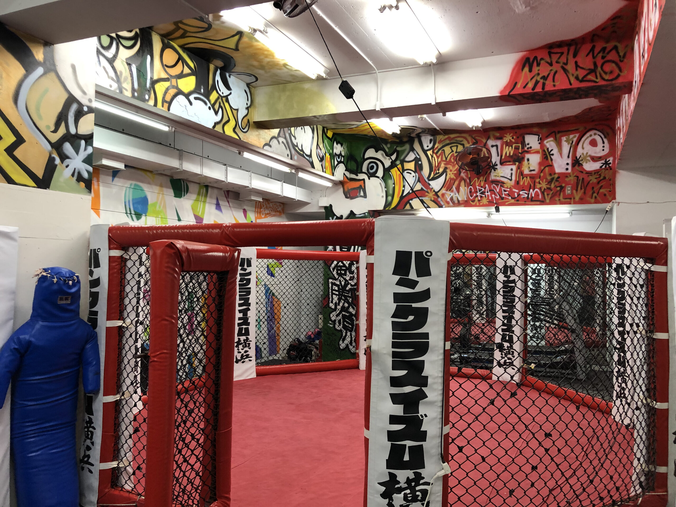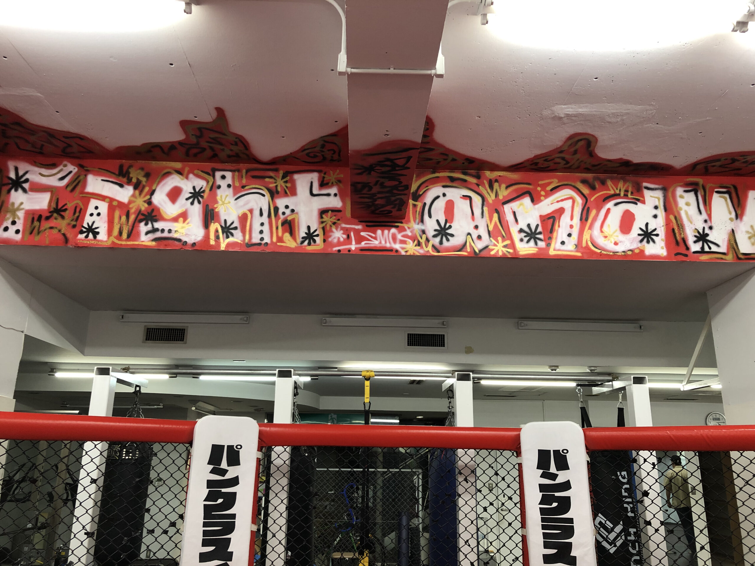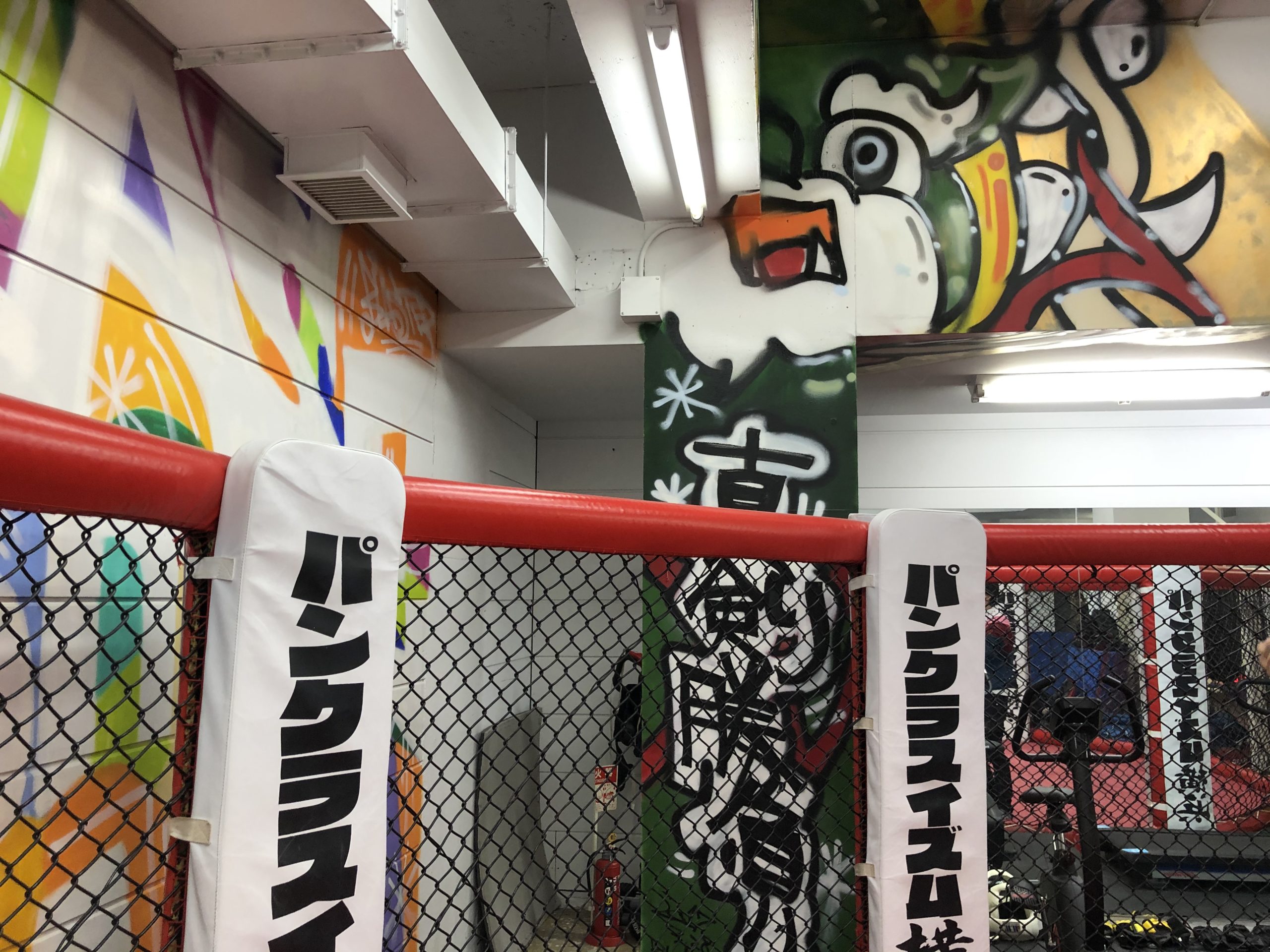 RIZINやパンクラス、DEEPなど日本を代表する格闘技イベントで活躍をされている総合格闘家の北岡悟選手が代表をされているパンクラスイズム横浜の壁画制作を2017年から4年間にかけて制作させていただきました。はじめて製作をさせて頂いた際にお伺いしたご要望はパンクラスのロゴのメインカラーである赤と黒を使わないデザイン、そして2回目の依頼となる2018年は風神雷神のイメージをケージ外側の支柱部分にお作りさせていただき、2020年のご依頼では1回目の依頼とは正反対のパンクラスのメインカラーである赤と白と黒を基調にしたイメージで製作。ブラスター松下の活動には決して欠かすことのできない大切な壁画作品となっています。